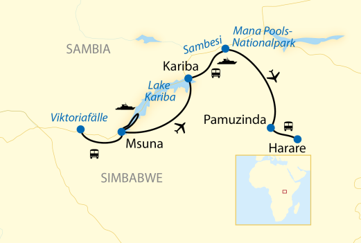 Diese Reise kombiniert den Genuss einer geruhsamen Schiffsreise mit Safari-Abenteuern rund um den mächtigsten Fluss im südlichen Afrika – den Sambesi! Bestaunen Sie zunächst die berühmten Viktoriafälle, bevor Sie in eine noch unberührte Region am Sambesi reisen, in die sich bisher kaum Besucher verirrt haben. Das Mündungsgebiet zum Kariba-See zeichnet sich durch großen Tierreichtum aus. An Bord Ihres Schiffes genießen Sie alle Annehmlichkeiten und beobachten entspannt vom Deck aus Wildtiere an Land und im Wasser. Mit kleinen Beibooten erkunden Sie auch kleinere Buchten und Inseln und kommen mit Glück Elefanten, Giraffen und ungezählten anderen Tieren ganz nah. Ein weiteres Highlight dieser Reise ist der Besuch des wildreichen Mana Pools-Nationalparks, wo Sie drei Nächte in einer herrlichen Lodge residieren und spannende Safaris entlang des Sambesi-Ufers unternehmen.