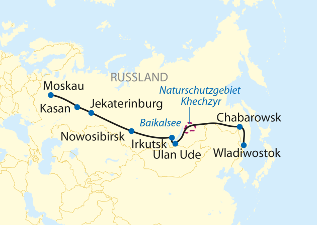 Unsere ursprünglichste Route: Moskau, Kasan, Nowosibirsk, Irkutsk, Ulan Ude, Tschita, Chabarowsk am Amur, Wladiwostok.