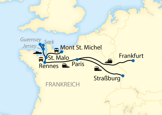 Erleben Sie eine außergewöhnliche Reise, die Sie zunächst mit dem Zug von Strasbourg bis in die kleine Küstenstadt St. Malo führt. Von dort gelangen Sie mit einer Fähre auf die größte der Kanalinseln, die Insel Jersey. Während Ihres Aufenthalts in St. Helier entdecken Sie nicht nur Jersey, sondern unternehmen auch sorgfältig komponierte Tagesausflüge zu den Nachbarinseln Sark und Guernsey. Jede dieser Inseln hat ihren eigenen Charakter – und alle laden dazu ein, sich treiben zu lassen und den besonderen Mix aus englischem Lebensstil und französischem Flair zu genießen. Nach Ihrer Rückkehr aufs Festland und einem gemütlichen Zwischenstopp in Paris bringt Sie Ihr Zug schließlich wieder zurück nach Deutschland – reich an Eindrücken und kleinen Inselmomenten.