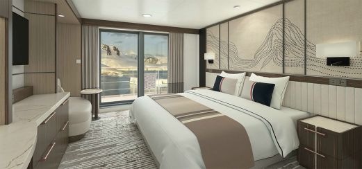 ca. 26m2, Deck 4 & 5, Doppelbett/ 2 Einzelbetten, Sitzbereich, privates Badezimmer mit Dusche, Kleiderschrank, Minibar, Safe, Flachbild-TV und Balkon
